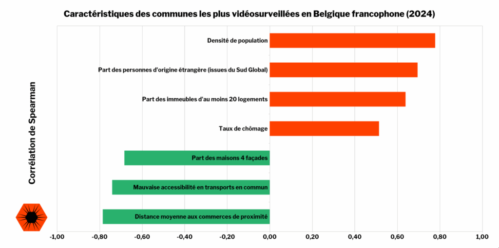 Ce graphe représente les corrélations de Spearman entre la densité de caméras de surveillance par commune en Belgique francophone fin 2024 et différentes variables. Plus la corrélation est proche de 1, plus les variables sont corrélées entre elles (c’est-à-dire qu’elles évoluent de concert, sans que cela ne suffise à établir une relation de cause à effet). Plus la corrélation approche de -1, plus les variables évoluent en sens opposés. Ont été comptabilisées tant les caméras fixes classiques, que les caméras temporaires et les ANPR.
